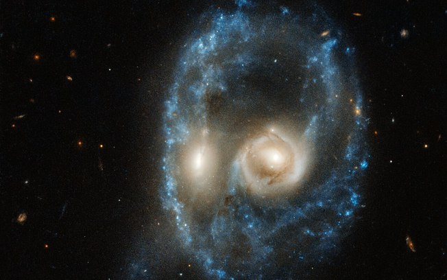 Humbble captura rosto bizarro. Colisão de duas galáxias moldaram uma face no espaço